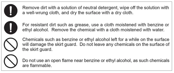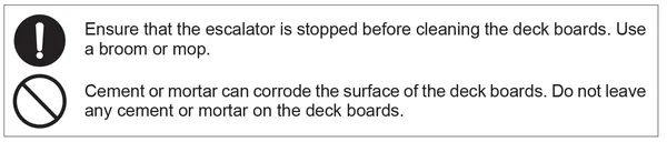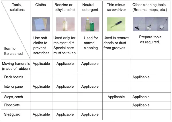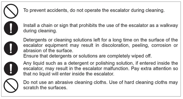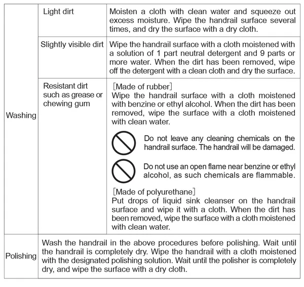 Many people touch the moving handrails. Ensure that the moving handrails are cleaned on a daily basis. However, do not clean the moving handrails excessively if the moving handrail is provided with special coating. Excessive cleaning may spoil the coating.