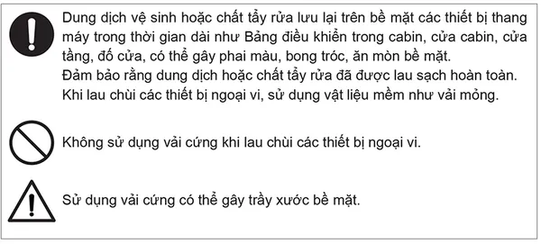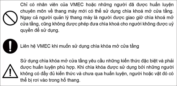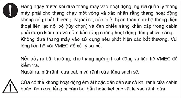 Song song với việc kiểm tra và bảo trì được tiến hành định kỳ theo hợp đồng với VMEC, việc kiểm tra và bảo dưỡng hàng ngày cũng cần được thực hiện bởi người quản lý thang máy. Điều này cực kỳ quan trọng để đảm bảo an toàn cho hành khách và thang hoạt động đúng chức năng. Người quản lý thang máy phải tuân thủ theo các hướng dẫn khi tiến hành kiểm tra và bảo dưỡng thang máy.
